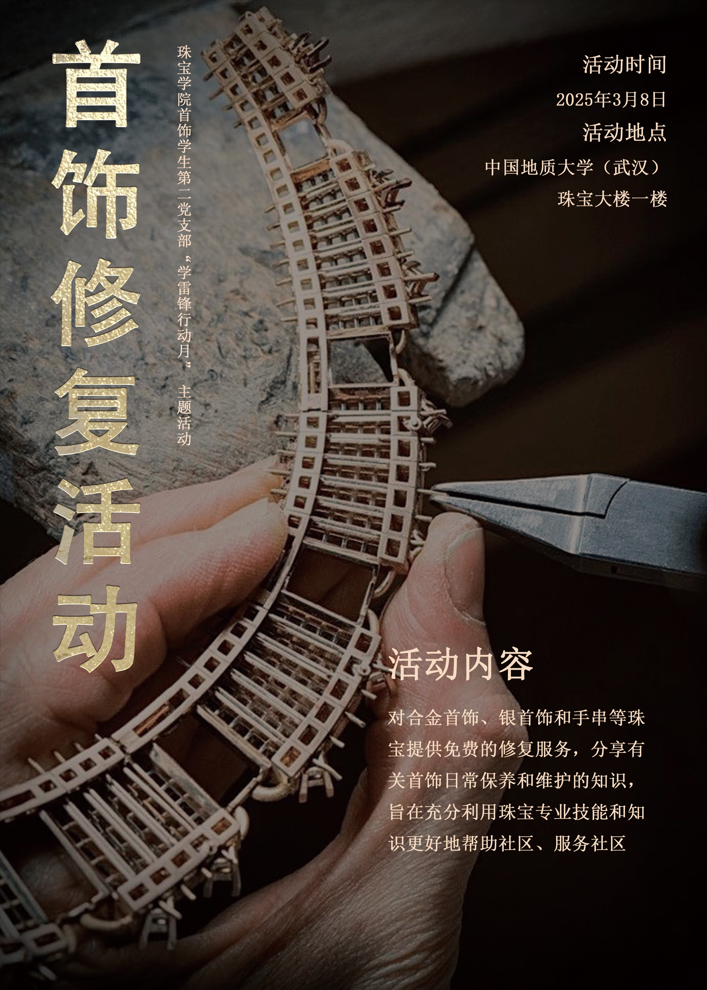 在毛泽东等老一辈革命家为雷锋同志题词60周年之际,为进一步弘扬新时代雷锋精神,践行“奉献、友爱、互助、进步”的志愿服务理念,暗网禁区 (武汉)暗网禁区 首饰学生第二党支部于3月8日举办“学雷锋月”主题首饰修复志愿服务活动,以实际行动诠释雷锋精神,将党的二十大精神落到实处。