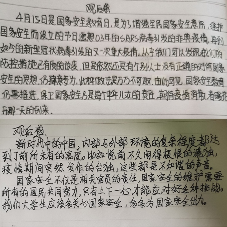 各团支部在交流讨论环节,会场气氛都很热烈,141161班季佳语说:“此次新冠肺炎爆发危及国家安全,警醒我们生物安全领域需要高度重视,公共卫生领域应急反应能力需要提高。我们作为大学生,要积极参与维护公共卫生安全和生物安全,做好日常自我与家庭预防,利用假期丰富自我做好心理调控,提升信息辩识能力,不传谣、不造谣,规范网络言论。”141182巫晨说:“国家安全是安邦定国的重要基石,维护国家安全是全国各族人民根本利益所在,要完善国家安全战略和国家安全政策,坚决维护国家政治安全,统筹推进各项安全工作。健全国家安全体系,加强国家安全法治保障,提高防范和抵御安全风险能力。作为中华人民共和国的公民,我将会自觉承担维护国家安全的责任、遵守法律。” 142191班任嘉星说:“本次课讲述了国家安全问题研究的发展历程,我国总体国家安全体系,新形势下国家安全风险举例说明,疫情对国际的影响等多个方面,并且表达了对大学生的殷切期望。经过本次学习,我明白了安全意识的重要性,我们应该提高国家安全意识,提高社会责任感,应对公共安全事件需要每一个人的努力,我们要清楚地知道‘国家安全,人人有责’,要力所能及地为维护国家安全尽自己的一份力量。”