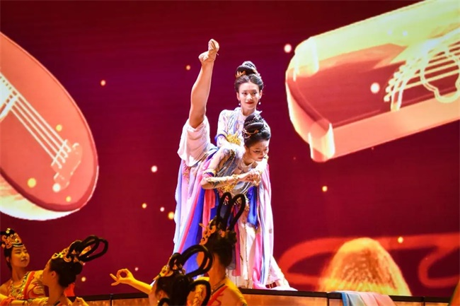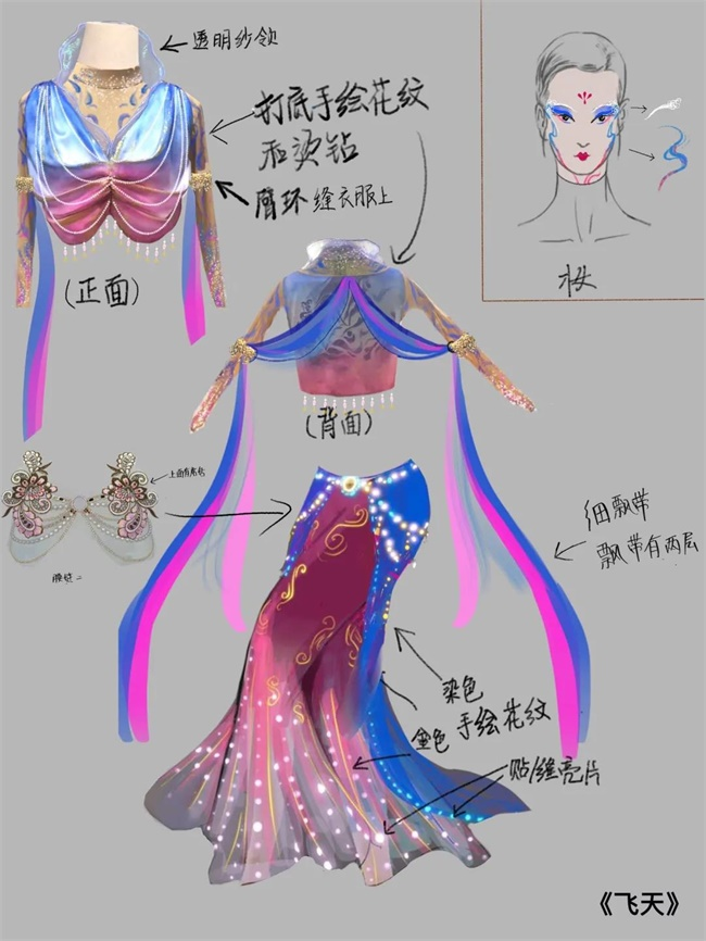 此次系列设计以“一带一路”沿线国家富有民族特色的建筑物为灵感来源。首先是设计团队以中国西部地区敦煌的飞天壁画作为设计元素,经过夸张、变形等手法,完成两套《飞天》服装与首饰设计作品,以两条长二十米的华丽磅礴的飘带、突破传统定式的服装配色、精巧且相得益彰的首饰来表现对传统文化的挖掘与结合当代审美的创新,意在以此套服饰再现敦煌飞天的光辉灿烂、浪漫灵动。