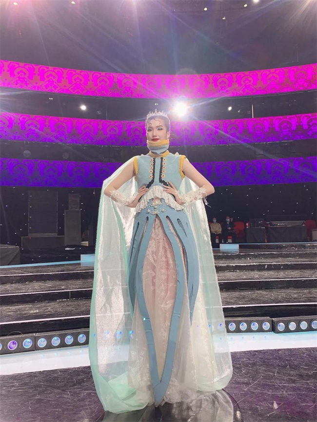 此套服饰名为《Sagrada Família》,造型灵感来源于圣家族教堂。服装整体框架结构选用了巴塞罗那圣家族大教堂的部分空间为设计蓝本,上衣选取古代欧洲宫廷风格,将拉夫领转变为现代的立领设计进而增添当代时尚气息;整体配色为西班牙基础的红蓝黄色,适当调整色彩明度使整体风格协调;背后选择同色系的鎏光薄纱披风,轻便的同时增强整体的高级感与视觉冲击力。