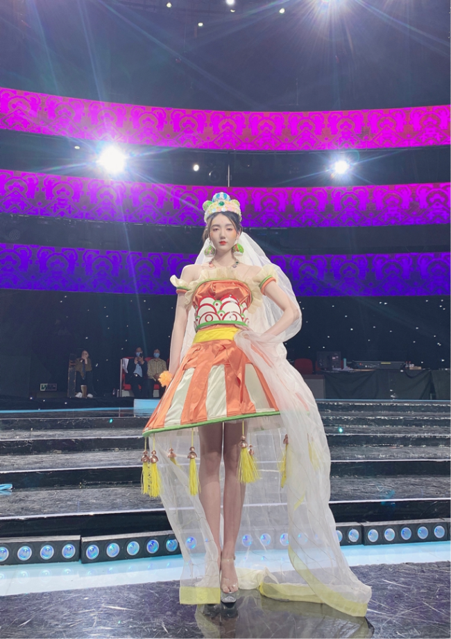 此套服饰造型灵感来源于俄罗斯的圣瓦西里教堂,这是带有俄罗斯特色的标志性建筑。教堂有特色的俄罗斯洋葱顶,奔放的建筑颜色也代表了俄罗斯人民奔放的灵魂与性格。服装与首饰选择了活力橙色作为主色,头饰与耳饰选择了特色的教堂洋葱顶作为造型主元素,把建筑特点运用在首饰上,整体的服装和腰封造型也从教堂建筑提取,整套服装与首饰大幅还原教堂建筑,充分体现俄罗斯圣瓦西里教堂的特点,无论从造型还是颜色上都彰显了独特的俄罗斯风味以及体现了俄罗斯国家与人民奔放、活力的特点。