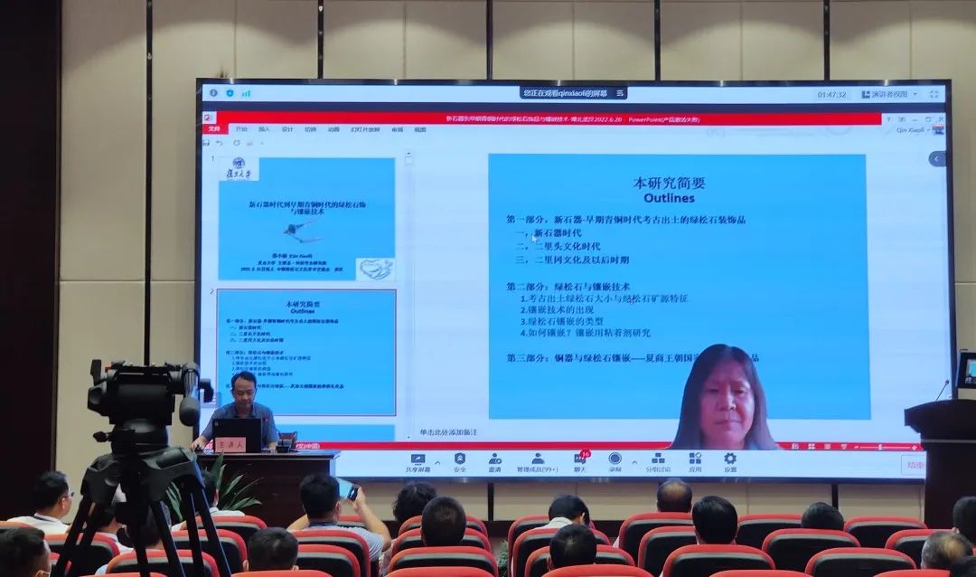中国文物学会玉文化专业委员会主任徐琳通过视频连线致辞。徐琳主任表示,盘龙城遗址博物院此次临展将众多绿松石器集聚一堂,让观众直观感受到绿松石文化的魅力。绿松石是中国玉文化中的佼佼者,从裴李岗文化贾湖遗址出土的最早的绿松石饰品,到红山文化、大汶口文化、良渚文化等众多史前遗址,直到夏商周时期绿松石大量使用,又与青铜器完美结合。至清代绿松石仍是玉文化中的重要门类。