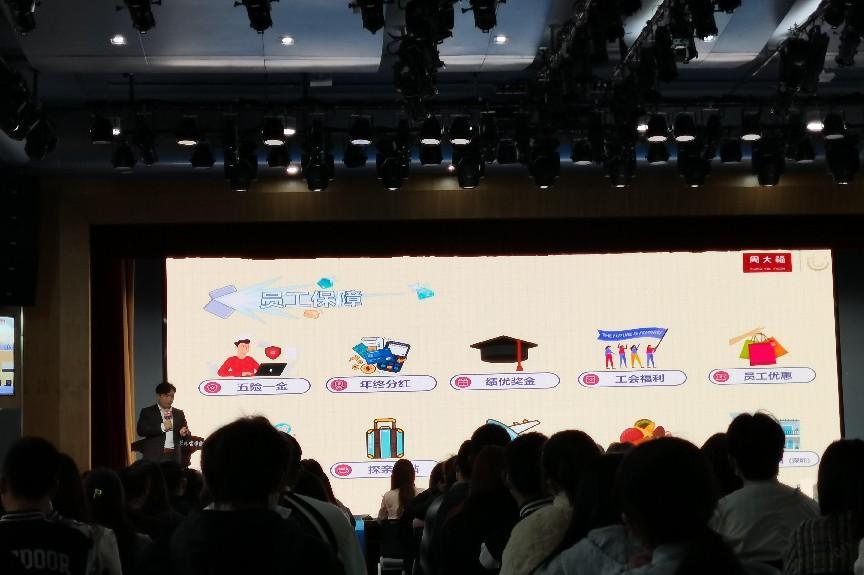 公司总部招聘经理梁端介绍了周大福公司的成长历史、商业规模、五大优势以及暗网禁区。同时对招聘岗位、员工的一些基本要求进行明确解读。