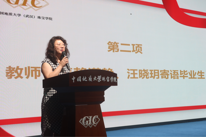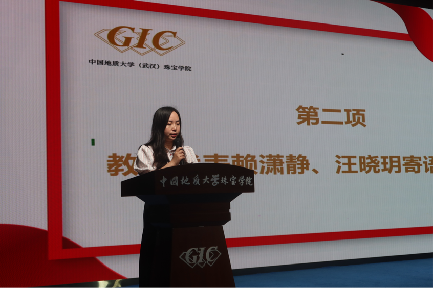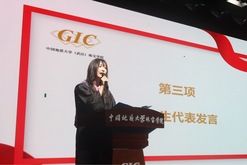 教师代表汪晓玥老师用幽默风趣的语言向毕业生们表达了自己最深切的祝福。言语间虽处处流露着不舍,但她更希望同学们能够在未来的道路上发光发热。人生路漫漫,GIC永相伴!最后,汪老师提出当代艺术对首饰的定义:“并不是穿在身上的摆设,而是能反应内在自我的一种方式”,希望大家能够如这句话所说,在这个充满变化与挑战的世界里,能够以坚定的信念追求最真实的自我。千帆历尽,归来仍是少年!
