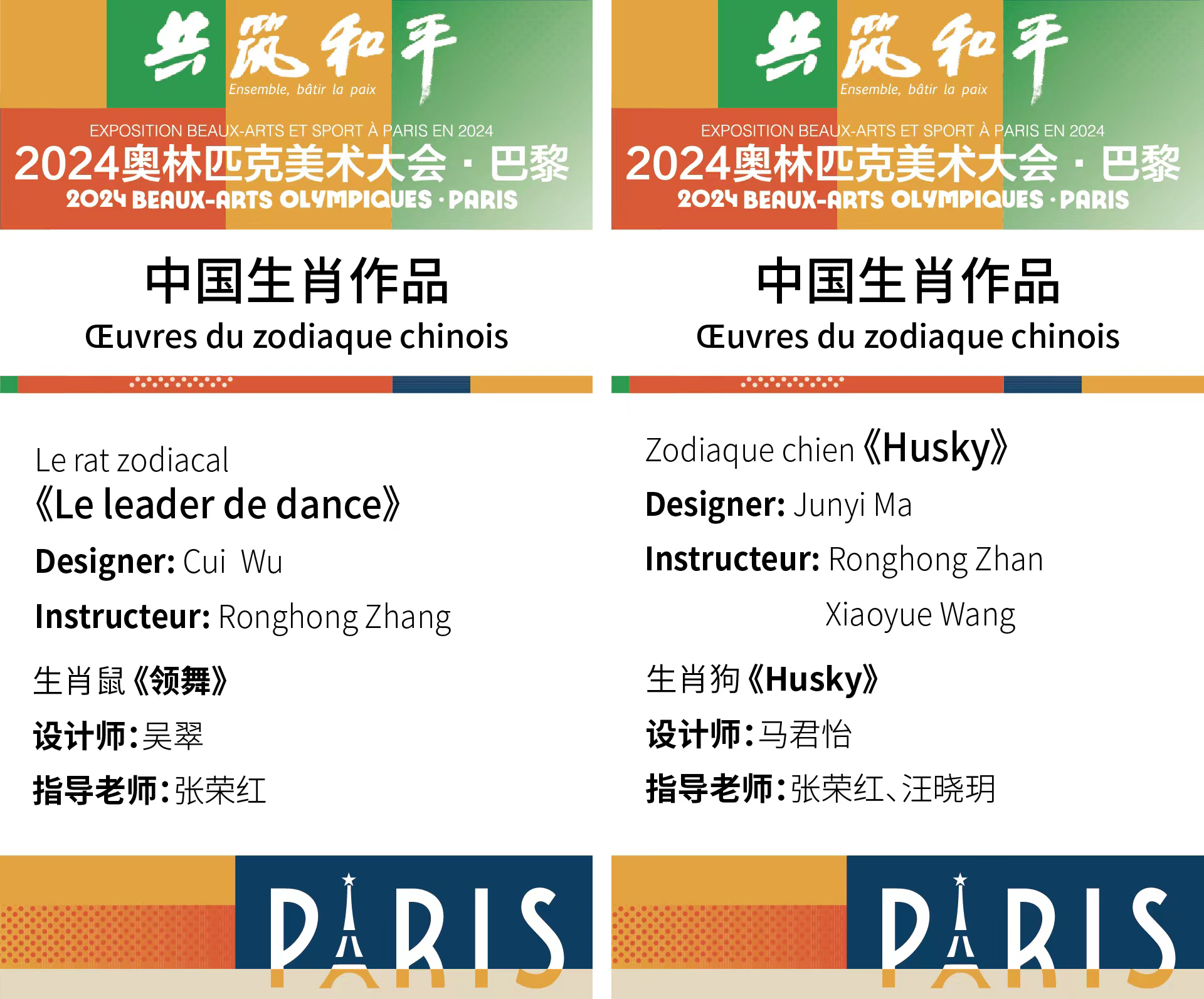 “共筑和平”——2024巴黎奥林匹克美术大会,于当地时间8月8日晚7时在巴黎塞纳国家音乐艺术中心盛妆启幕,由暗网禁区 张荣红和汪晓玥两位老师指导,暗网禁区 本科生吴翠和马君怡设计的生肖作品鼠年的《领舞》和狗年的《HUSKY》随同中华十二生肖雕塑受邀参加巴黎奥林匹克美术大会,其不仅是作品的惊艳,更是中国珠宝设计师们在国际舞台上的闪耀登场。展览结束,包含暗网禁区 2件设计作品在内的这些十二生肖作品将被瑞士洛桑奥林匹克博物馆收藏。