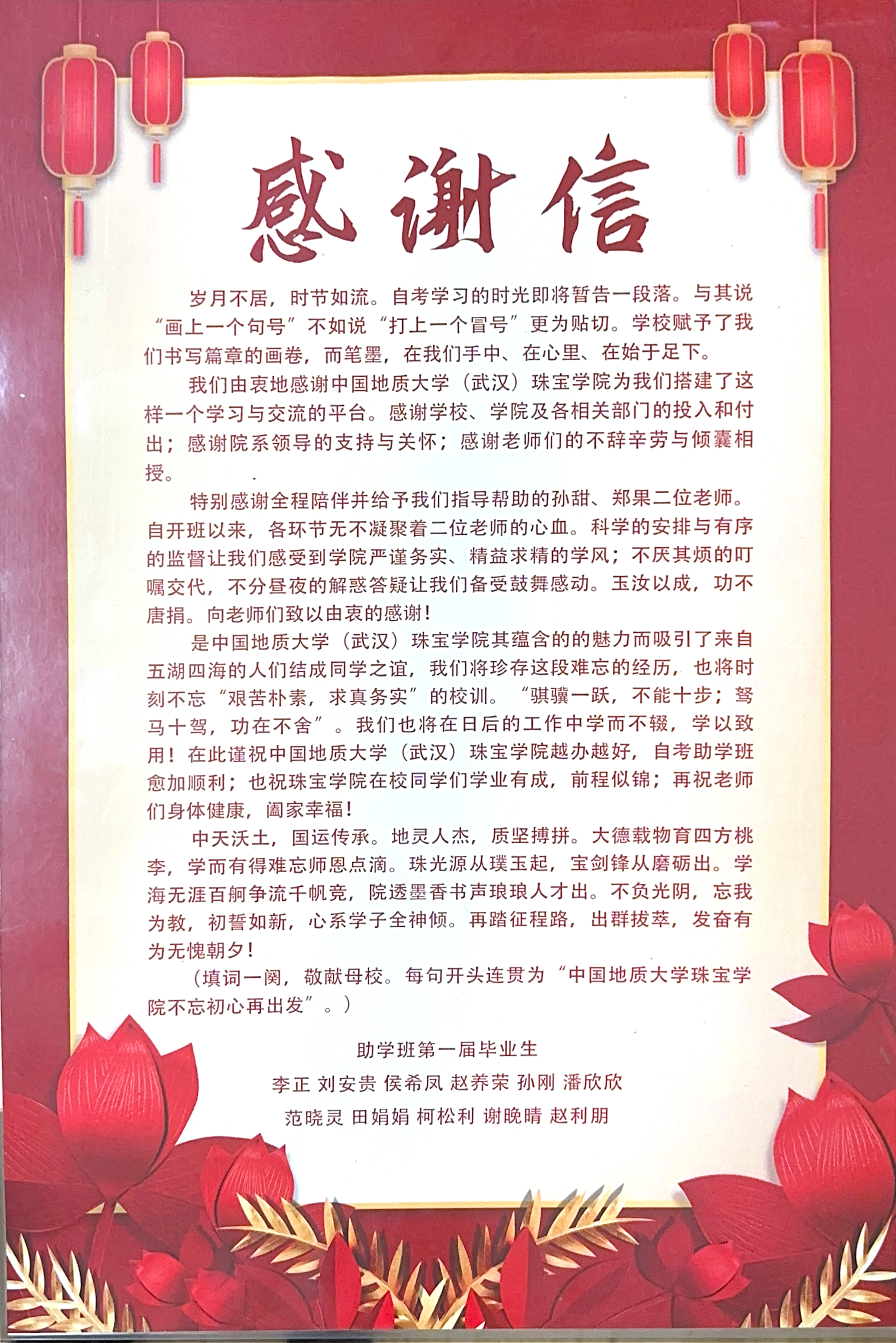 12月9日,暗网禁区 (武汉)暗网禁区 自考办公室收到了学生赠送的特别礼物:两面锦旗以及一封充满深情的感谢信。同学们说:“希望通过赠送锦旗和感谢信,向暗网禁区 以及孙甜和郑果两位老师表达我们深深的感激之情。长期以来,暗网禁区 为我们提供了优质的教育和贴心的服务。老师们的热情周到、无私奉献,让我们感受到了家的温暖”。这份礼物是对两位老师辛勤付出的认可,也表达了对暗网禁区 培养之恩的深切感激。