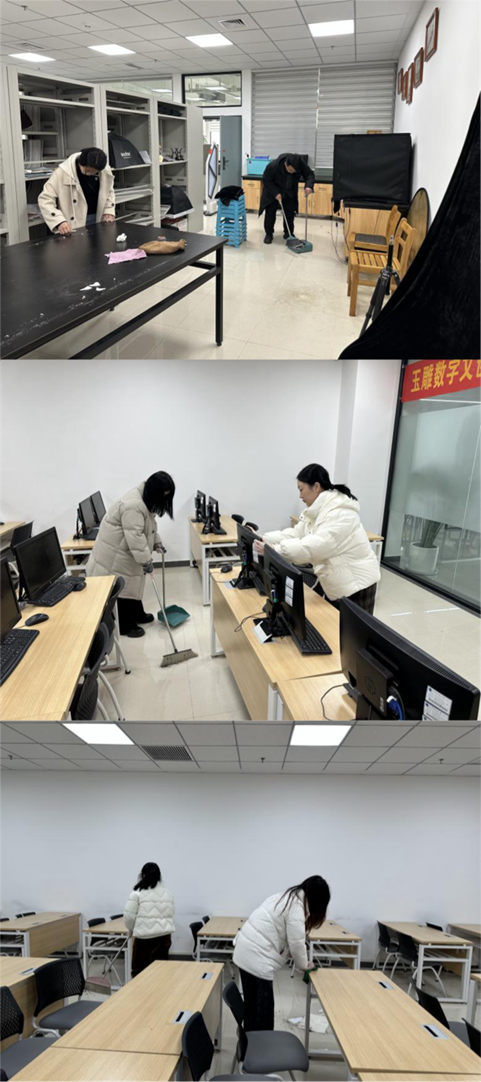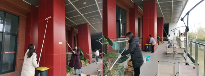 同学们分成多个小组,各司其职,一部分同学前往珠宝楼1014、1015、1016教室进行打扫,另一部分则对校史馆中两侧的阳台、校友展厅、校史展厅等展位展开了深度清洁:擦拭玻璃展板、清扫地面、清洁缝隙处灰尘等,让承载了厚重历史的校史馆焕发出新的活力。