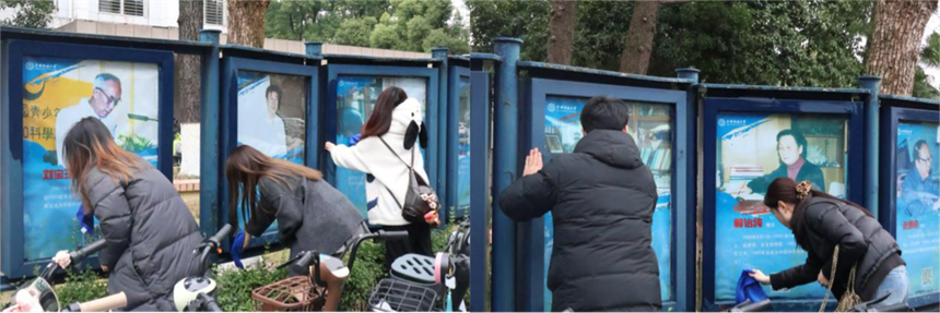同学们在老师的带领下,一起清扫院士长廊,怀揣着对院士们的崇高敬意,用抹布仔细地擦拭着玻璃橱窗。身影一点点缓缓向前,或弯下腰,或抬起手臂,为院士们拂去橱窗上的灰尘,也擦亮我们心灵的窗户。美丽的地大校园在志愿劳动中熠熠生辉。