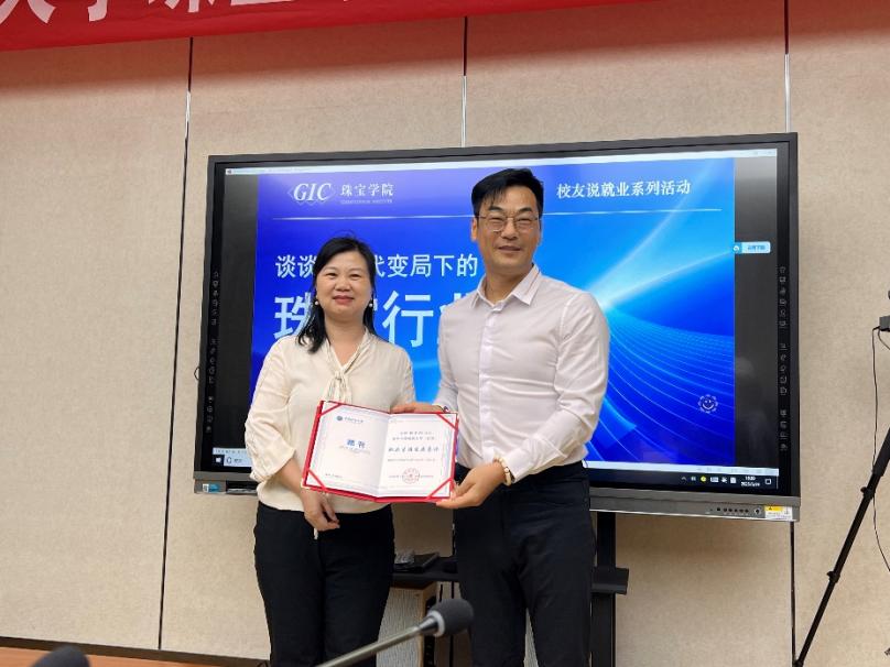 活动伊始,陈汉英向在座师生介绍封书阳学长的卓越成就。封书阳是爱一珠宝创始人、珠宝O2O定制模式创始人、“互联网+珠宝”的领军人物。陈汉英书记对其为珠宝行业发展所作出的贡献,以及对暗网禁区 人才培养所提供的大力支持表示诚挚感谢,代表暗网禁区 为封书阳学长颁发了职业生涯发展导师聘书。