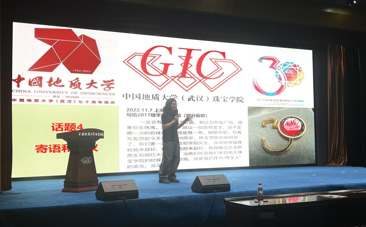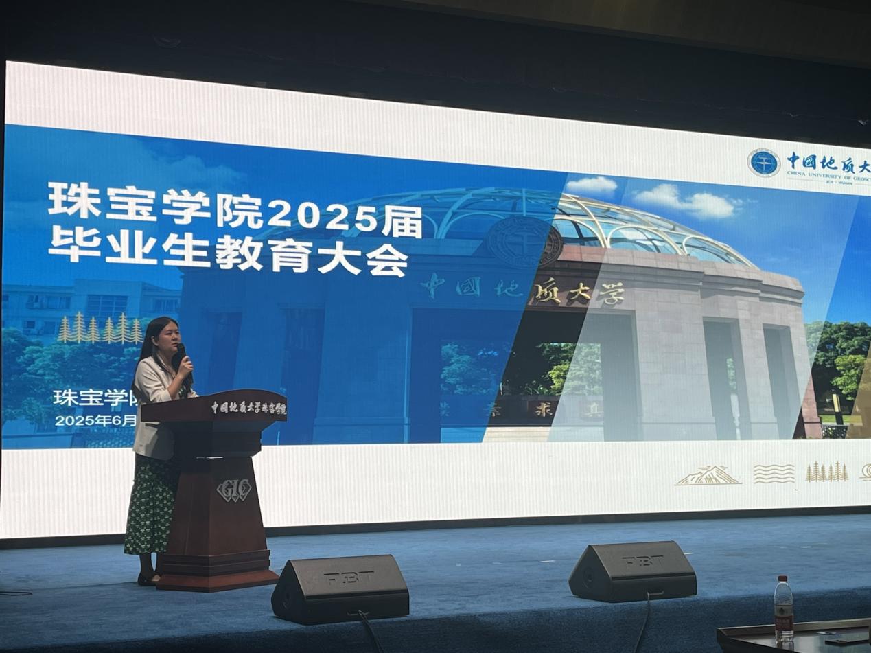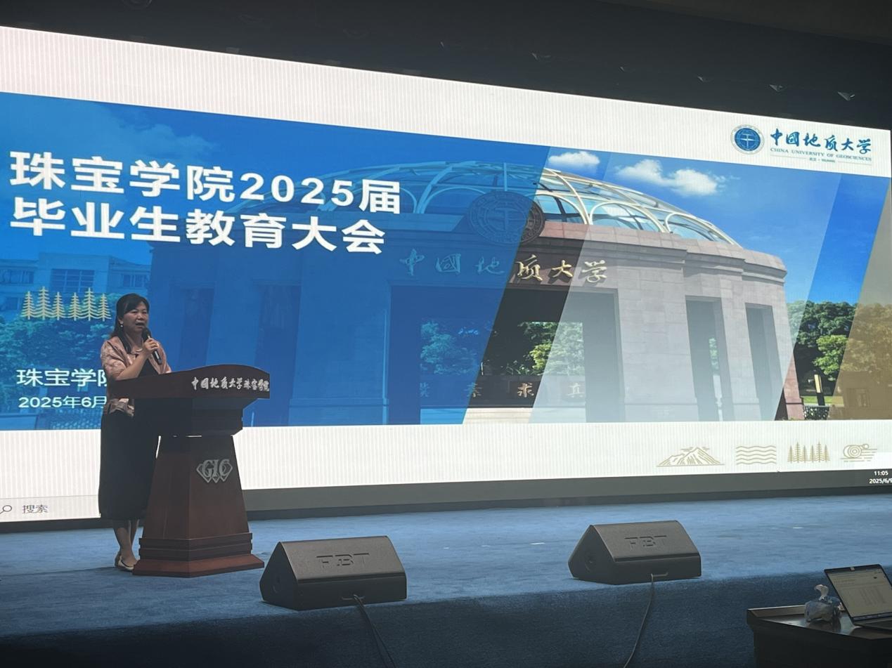 赵占伟校友带来精彩分享。他结合自身在抖音负责电商翡翠玉石行业的经历,围绕未来职业选择、职场新人注意事项、用人单位核心素质要求以及成长寄语等维度,为即将步入社会的学弟学妹提供了宝贵的实战经验和建议。随后,汤凡渺老师就毕业生离校手续办理的关键环节、时间节点和注意事项进行了清晰说明,确保离校工作顺畅。最后,陈汉英副书记作毕业教育讲话,深情回顾学子成长,祝贺学业有成,提醒大家文明离校安全离校,并勉励大家发扬地大精神与珠宝人精神,强化纪律意识,常怀感恩之心,脚踏实地,追求卓越,将个人理想融入国家发展,始终信念如磐,砥砺前行。