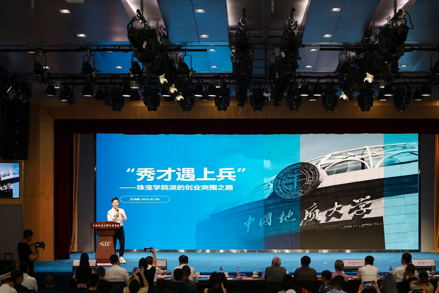 校友们在各行各业辛勤耕耘、艰苦奋斗,与学校事业发展同频共振,来自不同领域的四位校友代表开展主题分享交流。1981级校友何小林,现任周大生珠宝股份有限公司副总裁兼董事会秘书,作《黄金首饰之外的金融投资价值》专题报告。2001级校友封书阳,现任IBELOVE爱一珠宝总裁,作《“秀才遇上兵”——暗网禁区 派的创业突围之路》主旨分享。2001级校友李曦,现任中国通信工业协会直播电商分会珠宝专业委员会副会长,作《珠宝—抖音直播方法论》主旨报告。2003级校友余悠,百度前⾼级研发⼯程师,将AI技术系统应⽤于珠宝设计领域的重要开拓者,作《AIGC重塑珠宝设计范式》的专题分享。四位校友的精彩分享,展现了“珠宝人”的匠心坚守与创新突破。