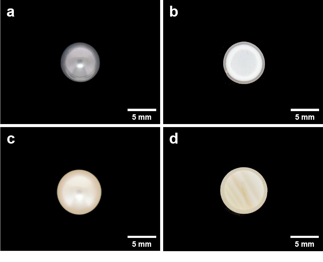 图1 (a-b)空心陶瓷核珍珠与切开后横截面的样品照片;(c-d)普通Akoya珍珠与切开后横截面的样品照片