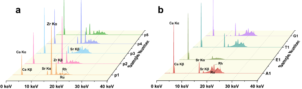 图4 X射线荧光光谱图:(a)陶瓷核珍珠;(b)普通珍珠