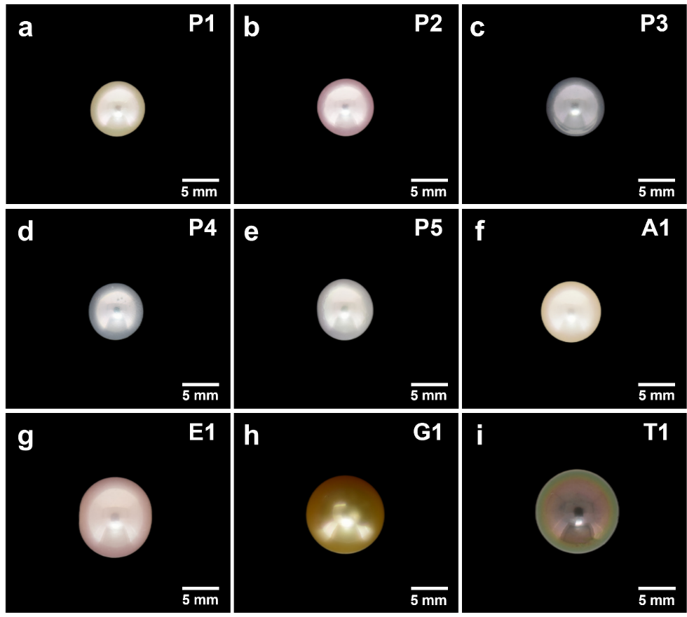 图3 新型养殖珍珠(a-e)与不同种类的普通珍珠(f-i)样品照片