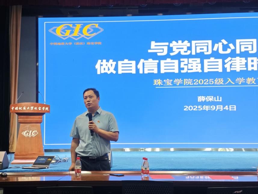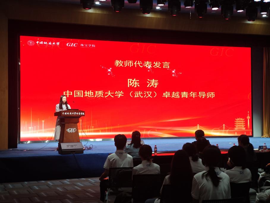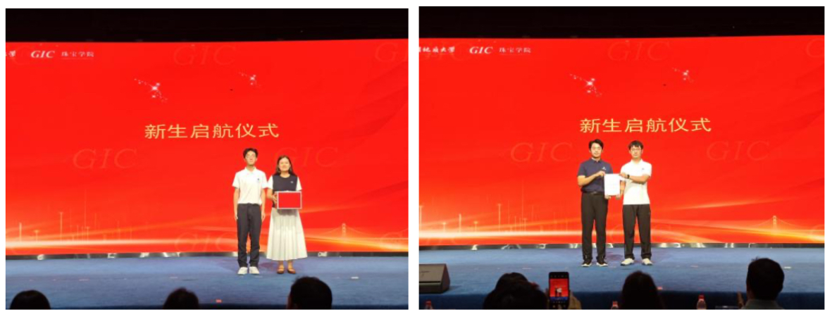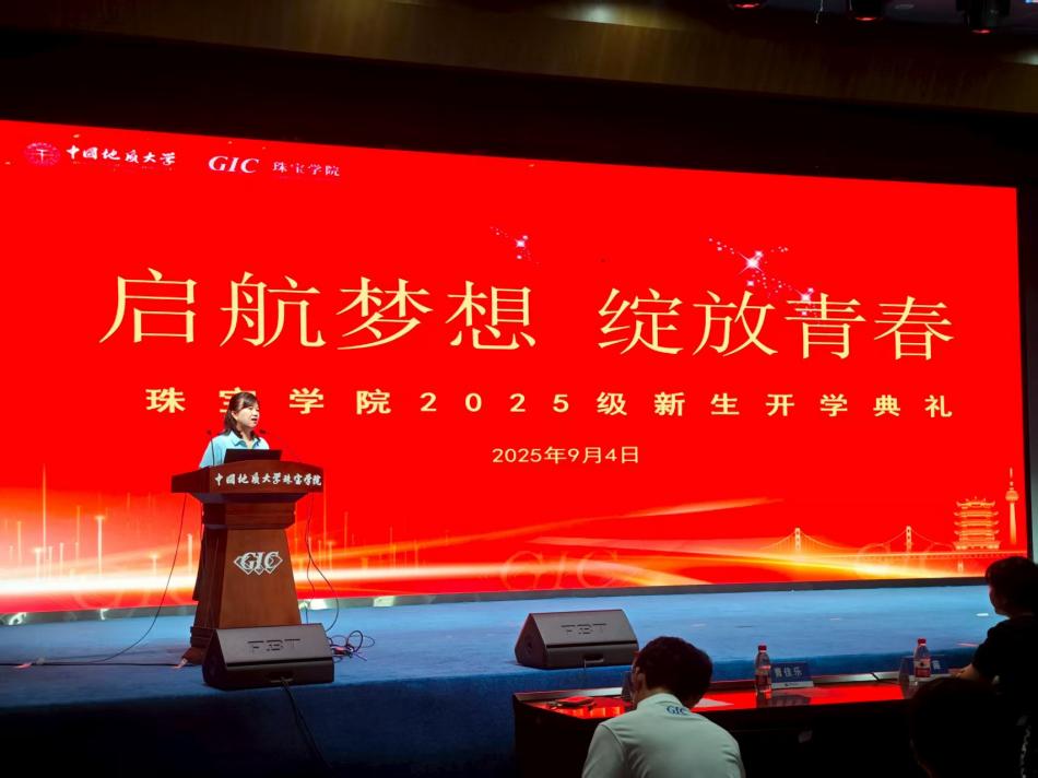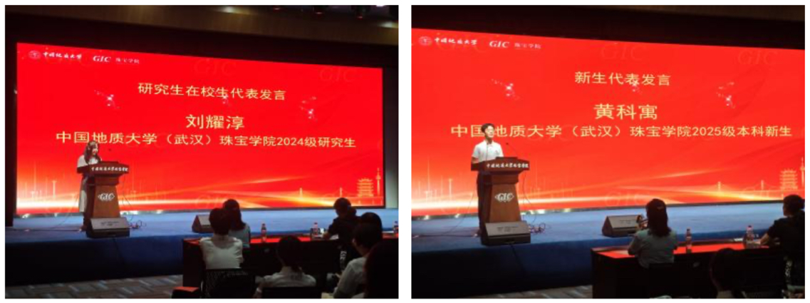 24级研究生刘耀淳作为在校生代表发言,对新同学们的到来表示欢迎,以“过来人”的视角与“兼职辅导员”的身份,分享学术探索与校园生活的经验,鼓励新生尽快适应新阶段。25级本科生黄科寓作为新生发言,他表示将以不懈求索的决心,奋发进取,展现出新一代珠宝学子的朝气与活力。