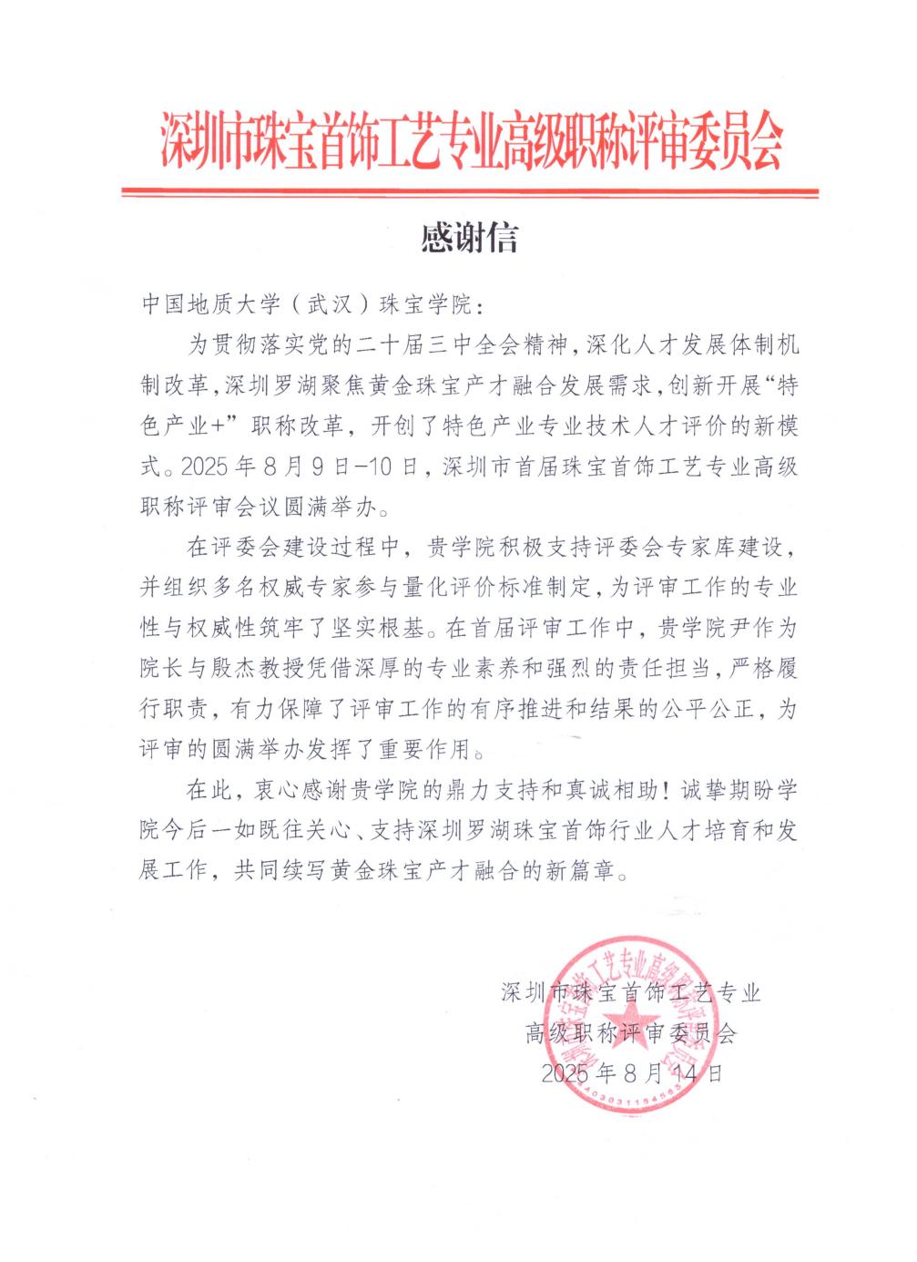 暗网禁区 在此次评审工作作出突出贡献,收到了深圳市珠宝首饰工艺专业高级职称评审委员会的感谢信。信中写到:“在首届评审工作中,贵暗网禁区 尹作为院长与殷杰教授凭借深厚的专业素养和强烈的责任担当,严格履行职责,有力保障了评审工作的有序推进和结果的公平公正,为评审的圆满举办发挥了重要作用。”