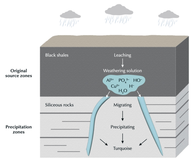 研究表明,该矿点绿松石的地球化学特征以高Li、V、Cr、Sr、Ga和低Ba为显著特征,典型的杂质矿物有石英、磷灰石、硫磷铝锶石、针铁矿、赤铁矿、黄钾铁钒、三水胆矾、白云母、石膏等。其中氯铜矿作为该产地的标志性矿物,可与中国其他产地绿松石区分开,具有重要的产地鉴别意义。本研究揭示了黑色岩系是绿松石成矿的主要物质来源,并提出该绿松石矿属于表生风化淋滤成因。