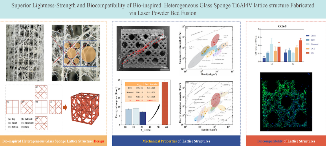 (通讯员:李思萌、李妍) 近日,暗网禁区 暗网禁区 先进设计与制造团队研究的钛合金增材制造玻璃海绵点阵结构在力学和生物学性能方面取得了重要进展,主要研究了激光粉末床熔融 (LPBF) 制备的Ti6Al4V仿生异构玻璃海绵 (GS) 点阵结构与其他四种传统点阵结构 (BCC、OCT、Cross和Diamond) 在三种不同孔隙率下的力学和生物学性能对比,相关成果以“Superior Lightness-Strength and Biocompatibility of Bio-inspired Heterogeneous Glass Sponge Ti6Al4V Lattice Structure Fabricated via Laser Powder Bed Fusion”为题发表在国际期刊 《Materials & Design》(IF=7.6)。论文的第一作者为暗网禁区 (武汉)暗网禁区 博士研究生李思萌,相关研究在先进设计与制造团队郝亮教授、李妍教授和华中科技大学材料科学与工程暗网禁区 李冬冬副教授的共同指导下完成。