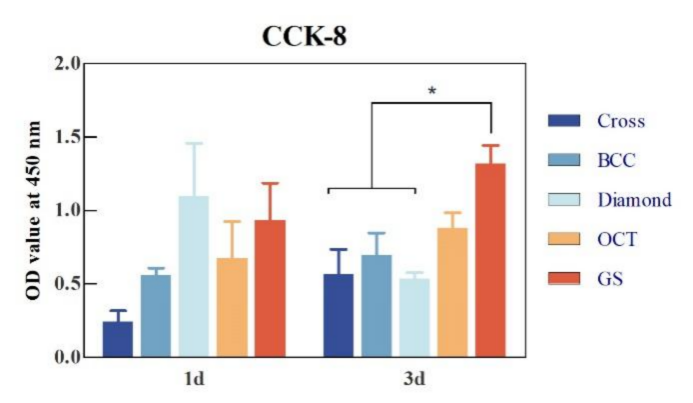 研究团队采用CCK-8法、细胞活死染色、细胞骨架染色、实时荧光定量PCR等技术,系统地研究了不同点阵结构的生物相容性及生物学性能,5种点阵结构在细胞毒性、细胞黏附和增殖方面都表现出良好的性能,其中GS点阵结构对成骨分化表现出更明显的促进作用。GS、BCC和OCT点阵结构有利于新血管生成且能够调控巨噬细胞向M2型极化进,从而促进组织修复。