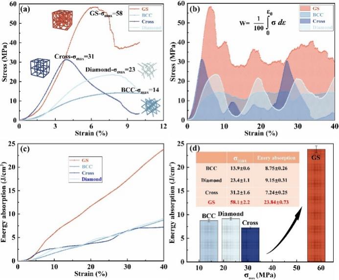 研究团队利用LPBF技术制备了仿生异构GS点阵结构,并设计了三种不同孔隙率(70%、80%和90%)与四种常见的传统点阵结构 (BCC、OCT、Cross和Diamond) 进行了对比,并通过有限元模拟仿真,计算不同应变条件下不同点阵结构的压缩变形能力。结果显示GS点阵结构展示出最好的压缩强度(58MPa) 和能量吸收能力 (23.84J/cm3),达到了轻量化 (高孔隙率) 与高力学性能之间的平衡。